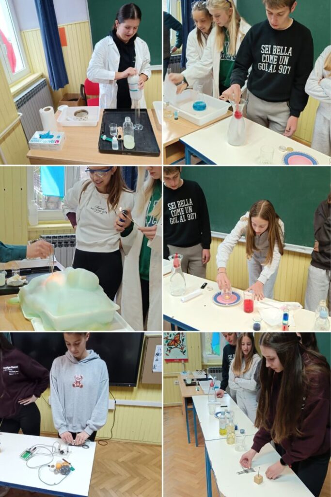 Tako su učenici 8. razreda pod mentorstvom učitelja Davida Jelenkovića (kemija) i učiteljice Kristine Bertoša (fizika) prezentirali raznovrsne zanimljive pokuse učenicima razredne nastave koji su sa zanimanjem sve pratili  i  sami se iskušali u  izvođenju nekih od njih.