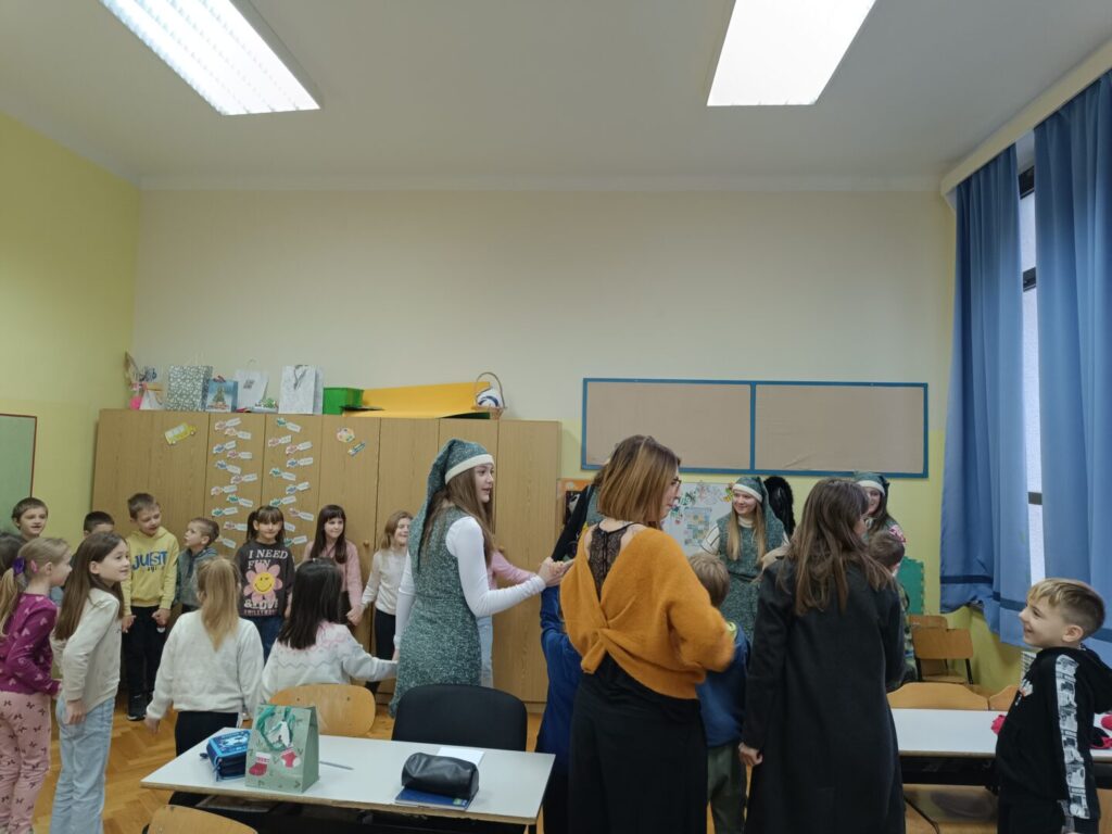 U blagdanskom ozračju, jučer su učenici razredne nastave naše škole razveseljeni podjelom poklona koju je organiziralo Društvo „Naša djeca“ Pazin. Posebnu čar ovom događaju dale su naše osmašice koje su, prerušene u vesele vilenjakinje, unijele pravu blagdansku čaroliju u školske hodnike.